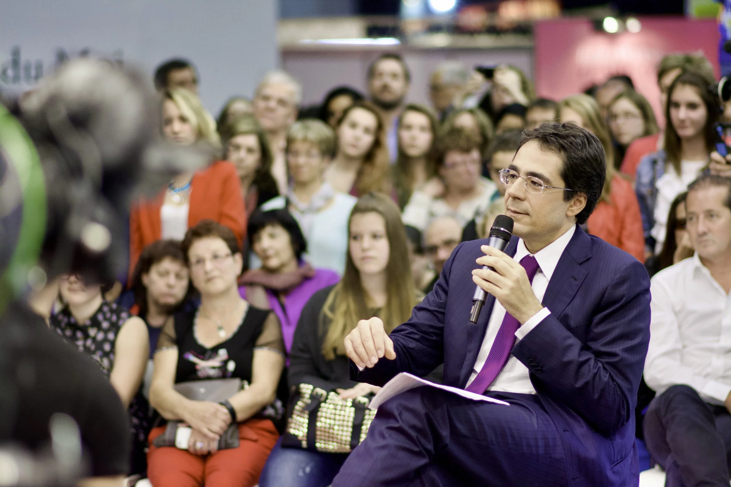 Darius Rochebin présente son talk-show "Pardonnez-moi", en direct du salon du livre 2013 à Genève. Voir en taille réelle
